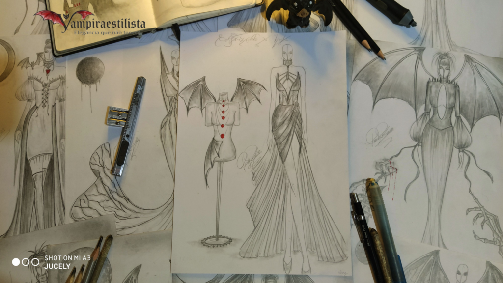 O corset que envolve seu corpo não é feito apenas de tecido, mas de memórias petrificadas — cada linha lembrando costelas, como se o próprio vestido fosse uma extensão de algo que um dia viveu.
