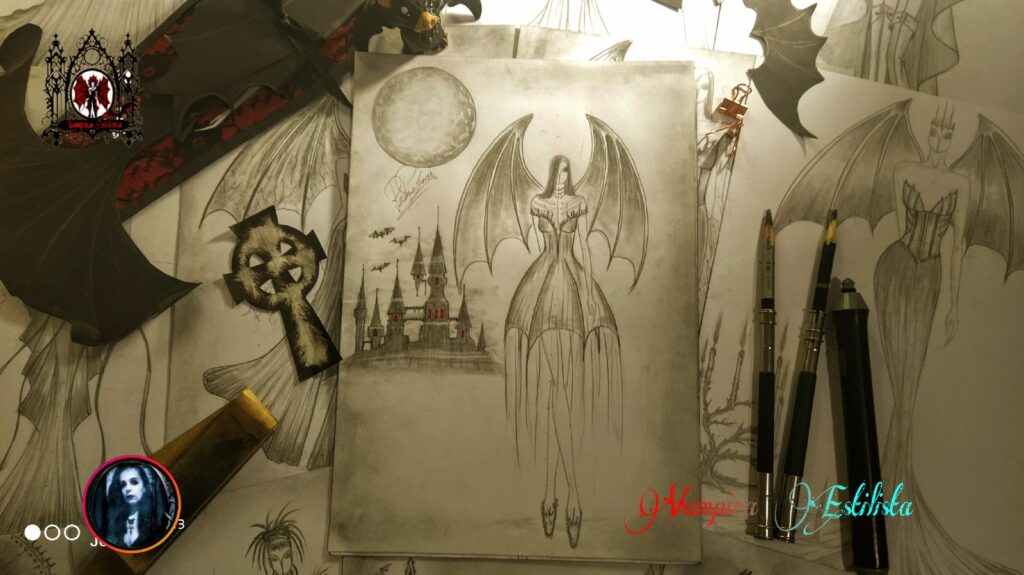 O desenho foi feito a lápis grafites e utilizada o esfumado de forma muito eficaz para criar sombras , volume especialmente nas asas e na lua e a névoa.