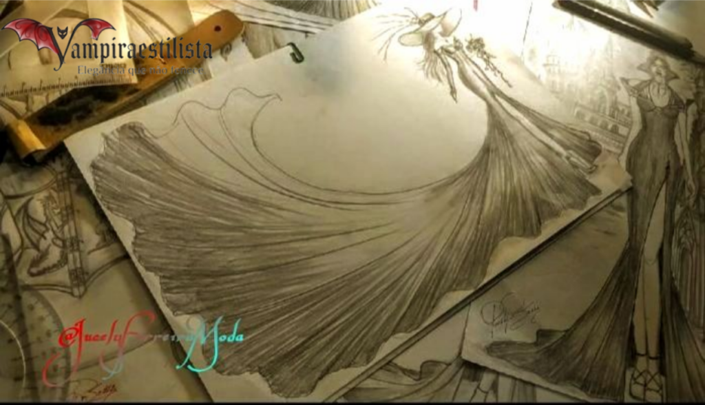 Croqui feminino, captura o movimento e fluidez da cauda longa do vestido com linhas suaves e curvas , sugerindo leveza e dinamismo. 🥀